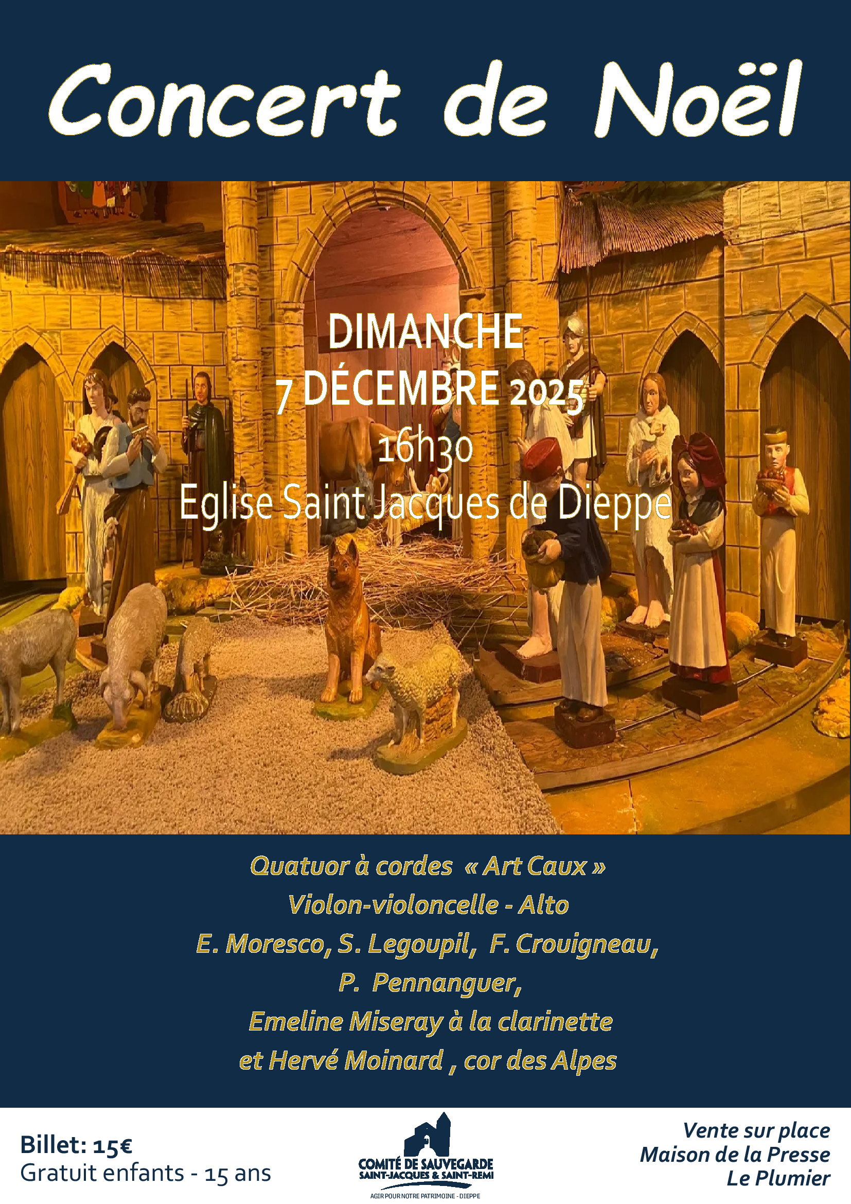 Un concert de Noël sera organisé le dimanche 7 décembre 2025 à 16h30 en l’église Saint-Jacques de Dieppe. L’évènement réunira le quatuor à cordes « Art Caux », accompagné de plusieurs musiciens : E. Moresco, S. Legoupil, F. Crouigneau, P. Pennanguer, Emeline Miseray à la clarinette et Hervé Moinard au cor des Alpes.